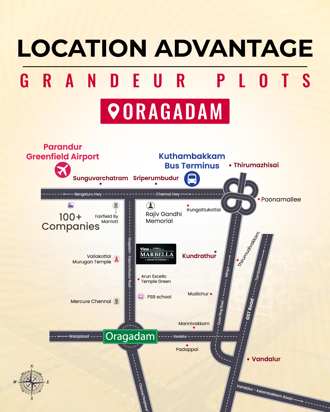 Located in a high-growth corridor, Vista Marbella offers seamless access to Kuthambakam Bus Terminal, Kilambakam Bus Terminus, SIPCOT, and major roads connecting to top corporations. Close to PSB School and well-linked to the upcoming Parandur Greenfield Airport, it ensures unmatched convenience, connectivity, and long-term value.
